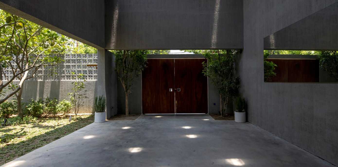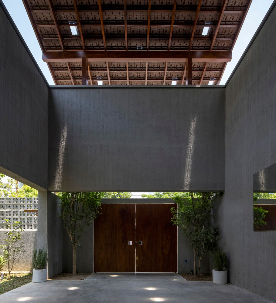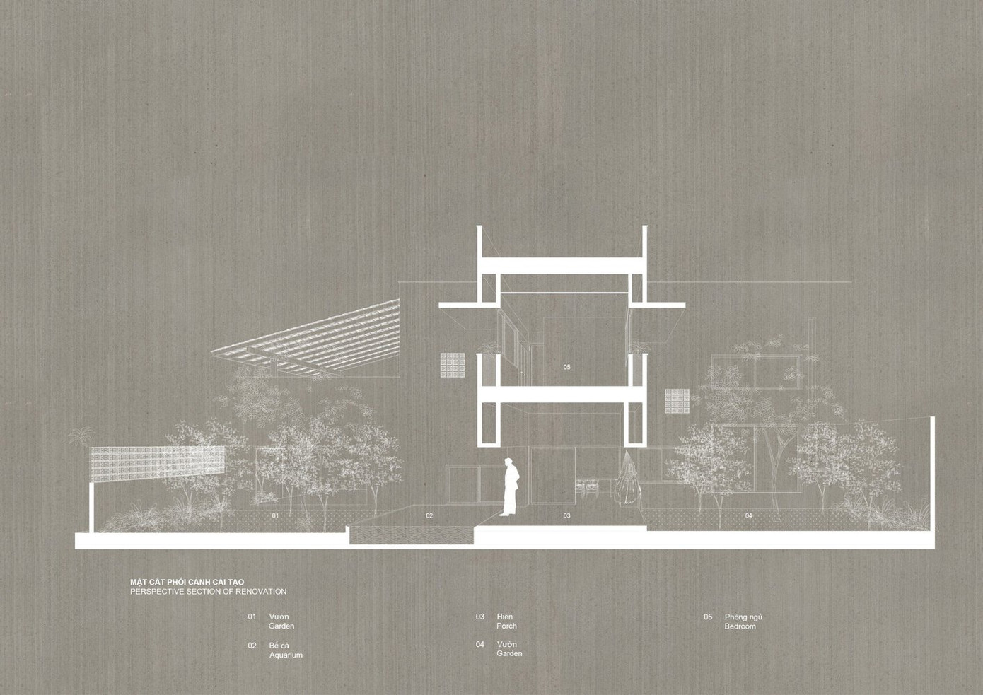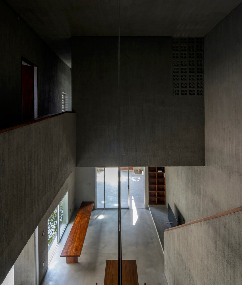 Dựa trên hệ thống khung kết cấu bê tông, cao độ tầng 1, cao độ tầng 2, mái nhà và các kích thước cố định của nhà cũ, nhóm thiết kế đã tạo ra một kết cấu hình chữ T gần như đối xứng với trung tâm đóng vai trò liên kết không gian cũ và không gian xây dựng mới.