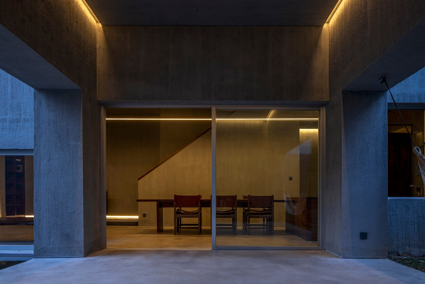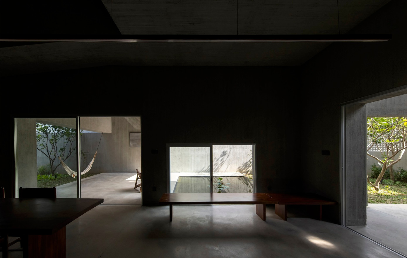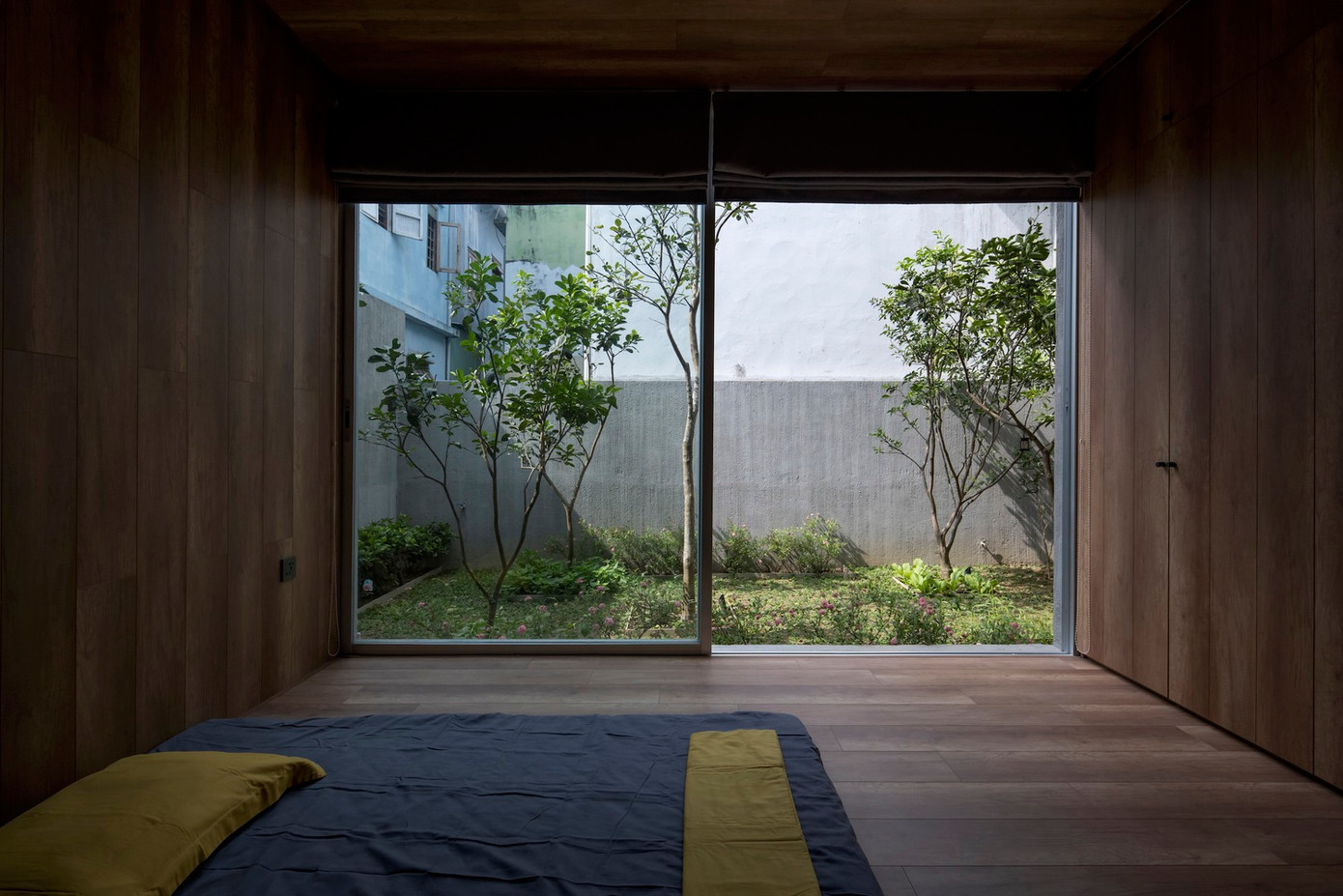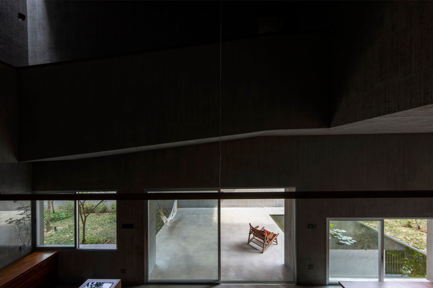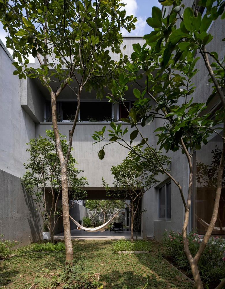 Giữa 2 bên là sân vườn và ao cá, phòng ăn mở giúp thông gió mát mẻ vào mùa hè từ hướng Đông và Đông Nam khắp toàn bộ tòa nhà. Bên cạnh đó, một phòng ngủ tiếp xúc trực tiếp với khu vườn sẽ là nơi cả nhà ngủ ở đây khi bà ngoại từ Huế về thăm.