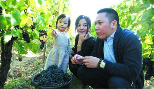 Triệu Vy cùng chồng và con gái trong vườn nho trĩu quả.
