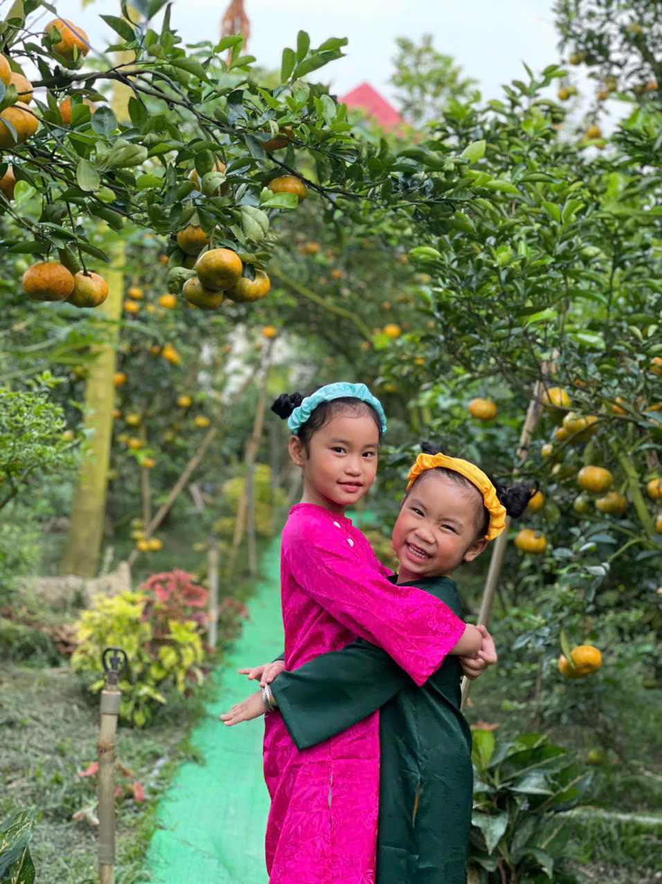 | Trẻ em tạo dáng chụp ảnh bên vườn quýt. |