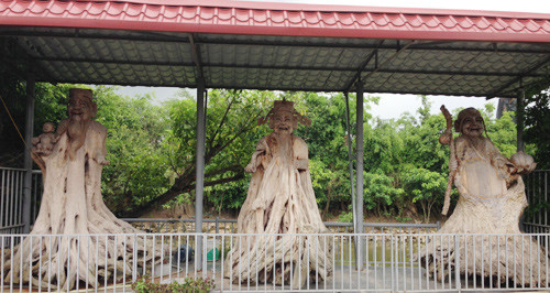 Bộ Tam Đa Phúc Lộc Thọ làm từ gốc cây cổ thụ như một điểm nhấn trong khu vườn