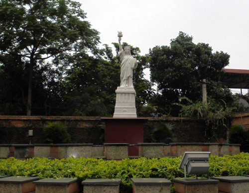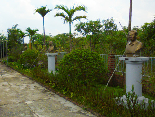 Khu vườn ở ven sông Hồng, gia chủ đặt những bức tượng các danh nhân nổi tiếng của Việt Nam, trong đó dễ nhận biết một số nhà văn, nhà khoa học, các nghệ sĩ…