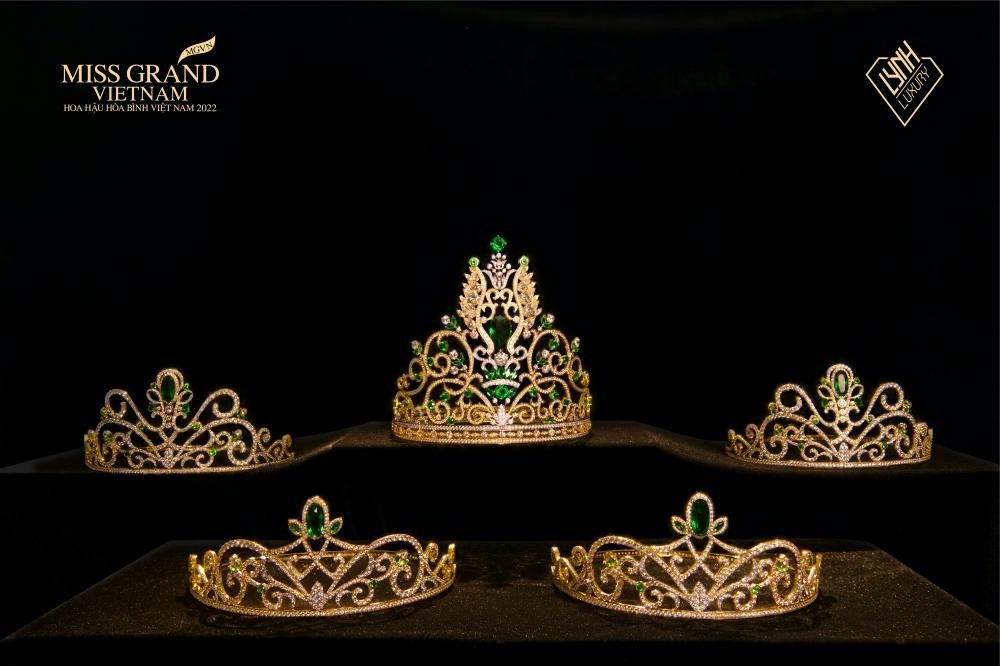 Trong thời điểm sự kỳ vọng của khán giả dành cho ngôi vị cao nhất của cuộc thi ngày càng tăng, BTC Miss Grand Vietnam 2022 chính thức công bố vật phẩm đăng quang của Top 5 chung cuộc gồm: Vương miện cho Hoa hậu và 4 vương miện cho Á hậu.