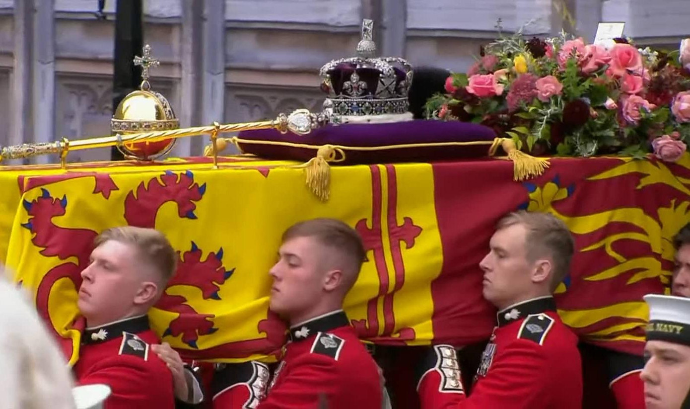 10h52’ (giờ địa phương): Đoàn rước đến cổng Tây của Tu viện Westminster. Nhóm khiêng linh cữu, bao gồm các thành viên đội cận vệ của Nữ hoàng, đưa linh cữu xuống từ cỗ linh xa.