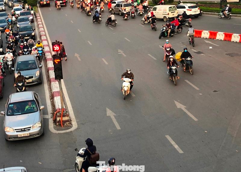 | Xe máy bất chấp biển báo, dải phân cách theo phương án phân luồng mới để đi ngược chiều tại một số hướng đi tại nút giao Ngã Tư Sở. |