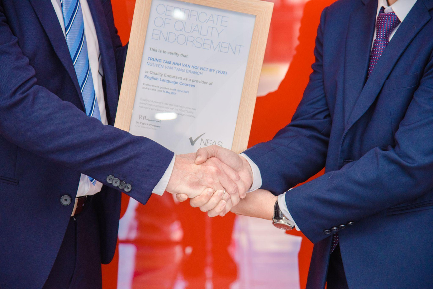 Ông Patrick Pheasant - Tổng giám đốc (CEO) của Tổ chức NEAS đã kiểm định trực tiếp tại các cơ sở VUS, bao gồm những cơ sở mới nhất của hệ thống như: Lê Trọng Tấn, Nguyễn Ảnh Thủ 2, Đỗ Xuân Hợp, Nguyễn Văn Tăng, Dĩ An, Tô Ký 2 và Nguyễn Văn Thủ. Đồng thời, Ông Patrick cũng trao bằng chứng nhận chuẩn quốc tế cho 7 cơ sở trong chuyến ghé thăm.