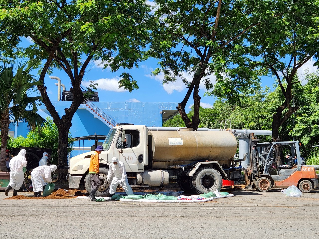 Sau khi hoàn thành diễn tập ứng phó sự cố hóa chất, Công ty VWS tiếp tục diễn tập tình huống giả định ứng phó sự cố tràn dầu. Tại Công ty VWS có các xe trung chuyển nhiên liệu. Trong quá trình tiếp nhiên liệu cho các xe khác trong nhà máy xử lý rác, khi đang tiếp nhiên liệu cho xe chở nước thì súng bơm dầu bị sự cố, dầu chảy tràn ra bên ngoài. Đồng thời van trên xe chở dầu cũng không khóa được, nguyên nhân có thể do bị kẹt hoặc tài xế mất bình tĩnh nên làm hư van. Vì vậy lượng dầu chảy ra liên tục.