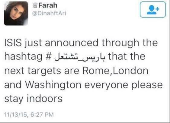 Một tài khoản Twitter có tên AnonRevolt - được cho là của một thành viên IS tiếp tục đưa ra cảnh cáo Washington, Roma và London sẽ là những mục tiêu tiếp theo của IS sau bi kịch đẫm máu tại Paris.