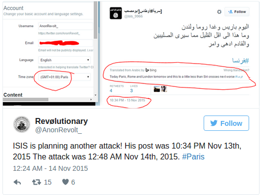 Đáng chú ý hơn, tài khoản này thậm chí đã cảnh báo Paris về cuộc tấn công của IS vài tiếng trước khi thảm kịch diễn ra. AnonRevolt đăng tải thông điệp đe đoạ vào 22h 34 phút ngày 13/11 (giờ địa phương), cùng thời điểm các cuộc tấn công liên tiếp nổ ra khắp Paris.