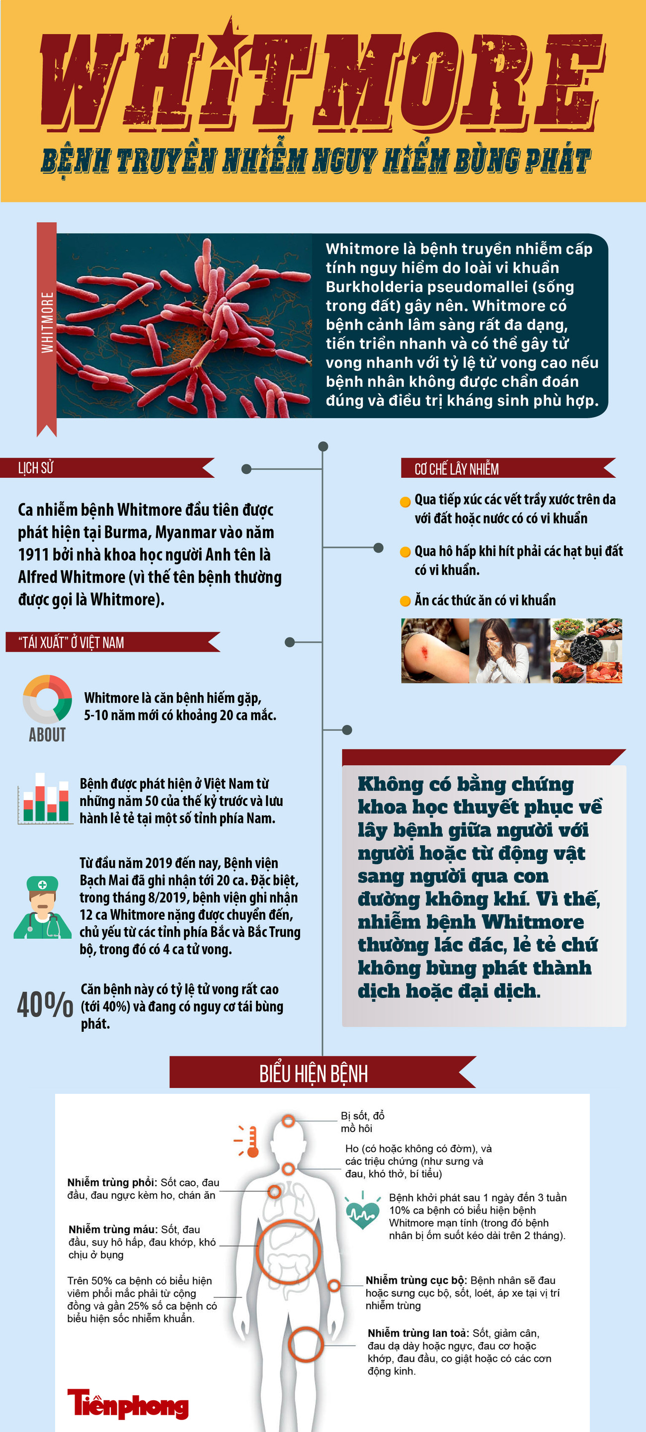 TPO - Whitmore là bệnh truyền nhiễm cấp tính nguy hiểm do loài vi khuẩn Burkholderia pseudomallei (sống trong đất) gây nên. Whitmore có bệnh cảnh lâm sàng rất đa dạng, tiến triển nhanh và có thể gây tử vong nhanh với tỷ lệ tử vong cao nếu bệnh nhân không được chẩn đoán đúng và điều trị kháng sinh phù hợp.