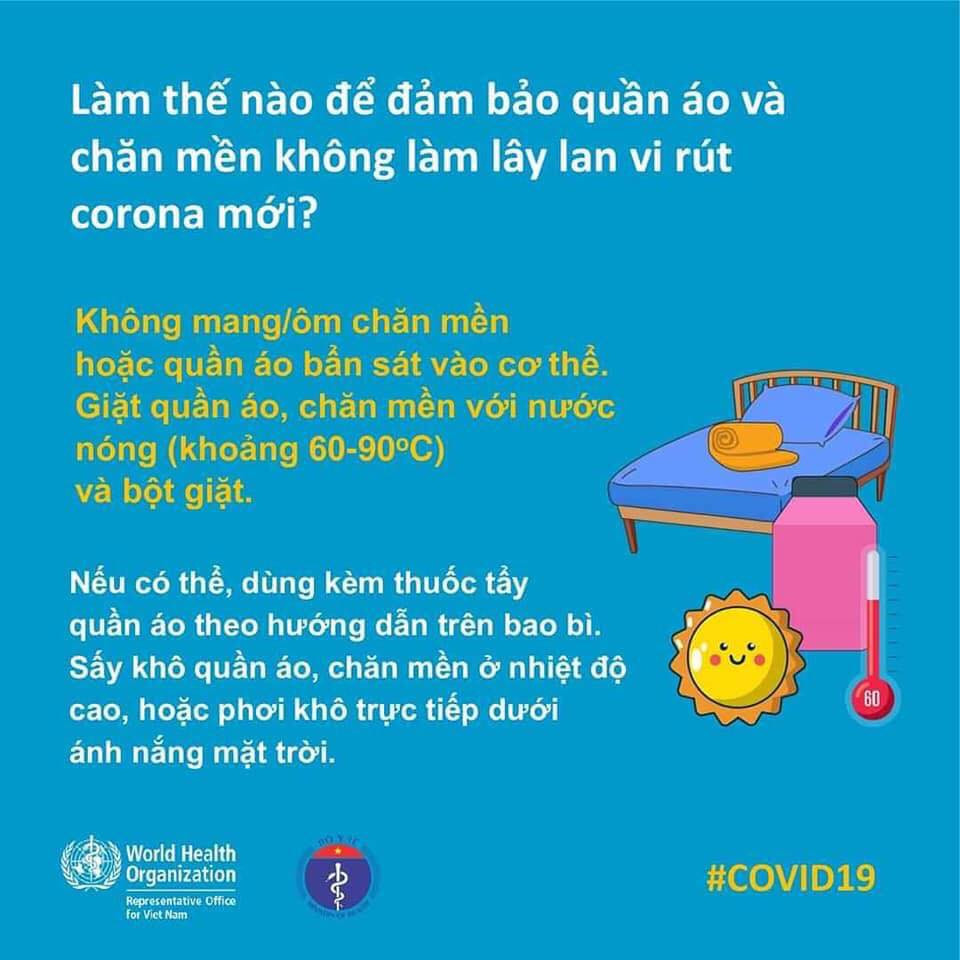 TPO - Tổ chức Y tế Thế giới (WHO) và Bộ Y tế đã ra khuyến cáo hướng dẫn cách tránh lây nhiễm Covid-19 vào chăn màn, quần áo. Đây là thông tin hết sức hữu ích khi dịch Covid-19 đang có nhiều diễn biến phức tạp.