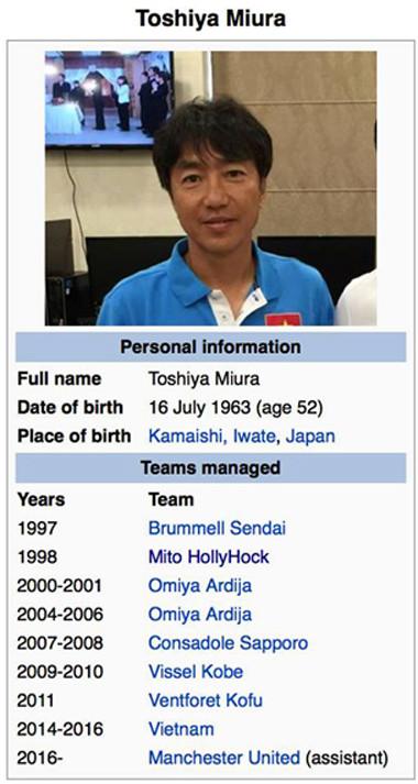 Thông tin khá sốc trên được trang từ điển mở Wikipedia phiên bản tiếng Anh đăng tải mới đây ngay trên trang chủ của mình khi ở phần hồ sơ có để quãng thời gian ông Miura bắt đầu làm việc cho M.U từ năm 2016.