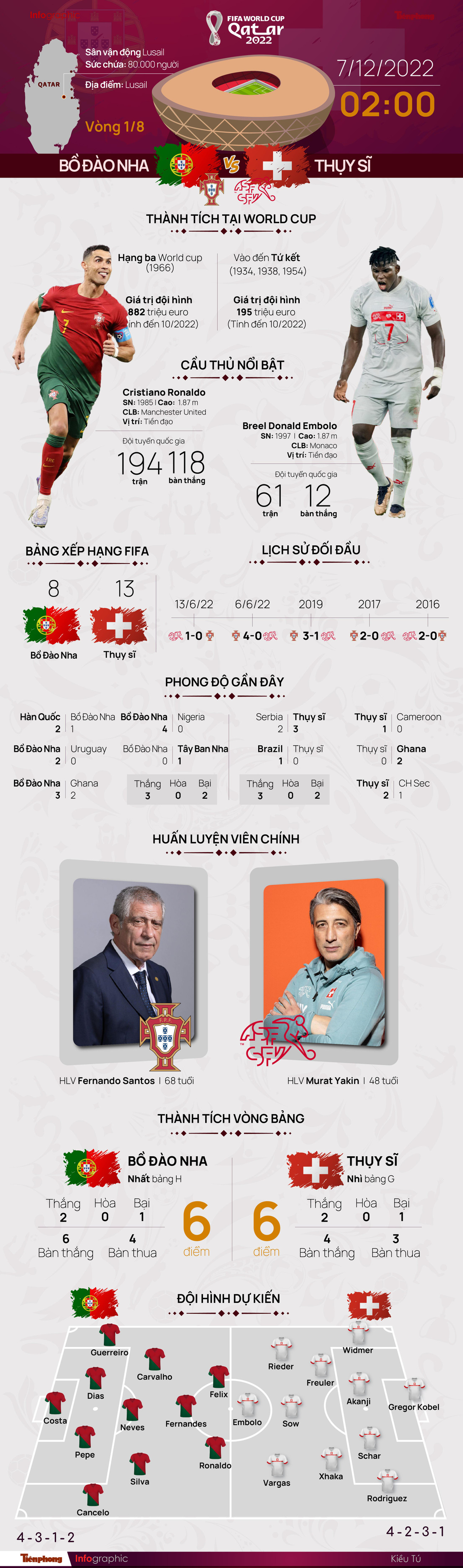 TPO - Trận cuối cùng vòng 1/8 World Cup sẽ là cuộc đối đầu giữa Bồ Đào Nha và Thụy Sĩ. Dù đã để thua ở lượt cuối, Bồ Đào Nha vẫn giữ ngôi đầu bảng H với 6 điểm. Bồ Đào Nha được đánh giá cao hơn, nhưng đội bóng xứ sở đồng hồ cũng luôn biết phải làm gì khi gặp những đối thủ mạnh.