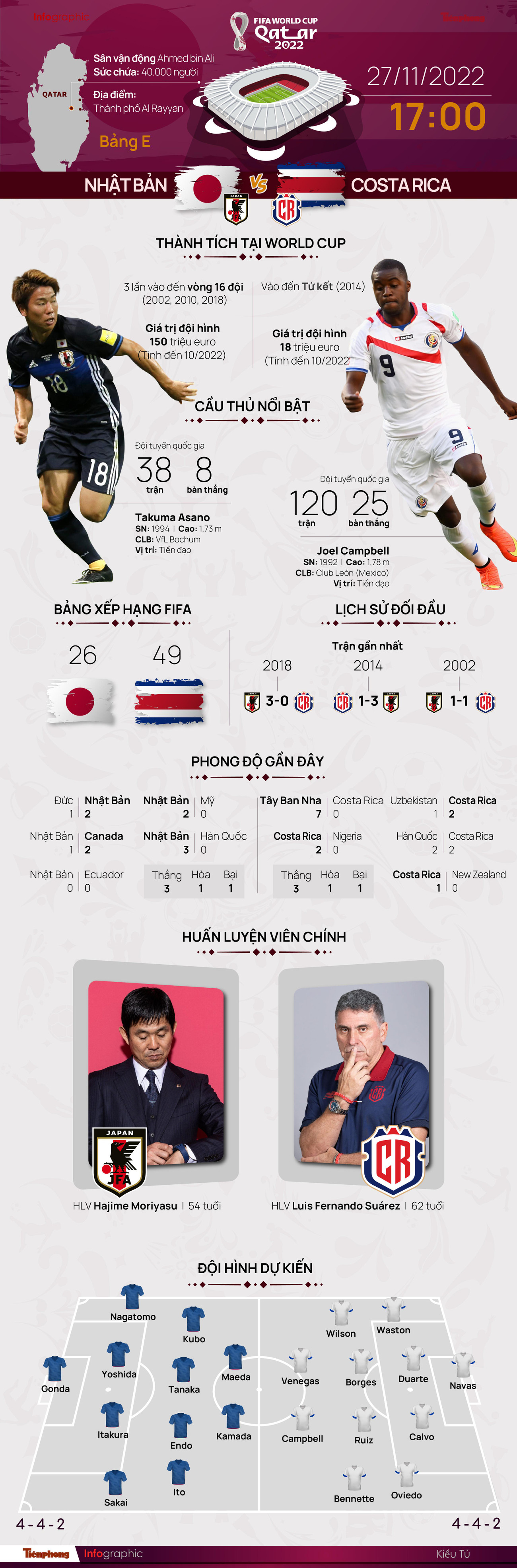 TPO - Đội tuyển Nhật Bản sẽ có trận đối đầu với Costa Rica trong khuôn khổ lượt trận thứ 2 của bảng E. Nhật Bản được đánh giá thấp tại bảng đấu nhưng họ đã tạo nên bất ngờ khi đánh bại tuyển Đức. Bên kia chiến tuyến, Costa Rica vừa nhận thất bại thảm hại 0-7 trước Tây Ban Nha. Xét về mặt tổng thể đại diện đến từ châu Á vượt trội hơn hẳn.