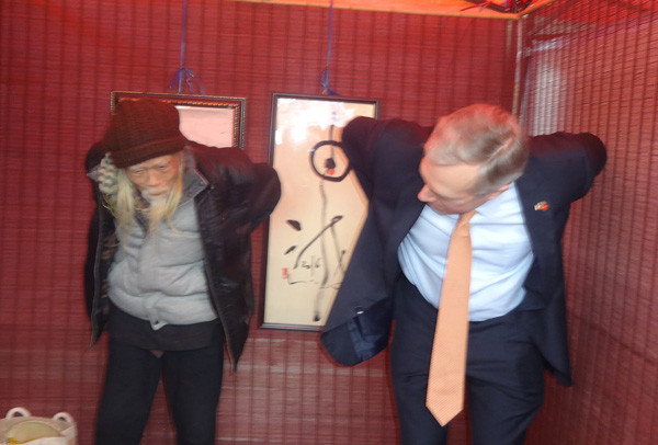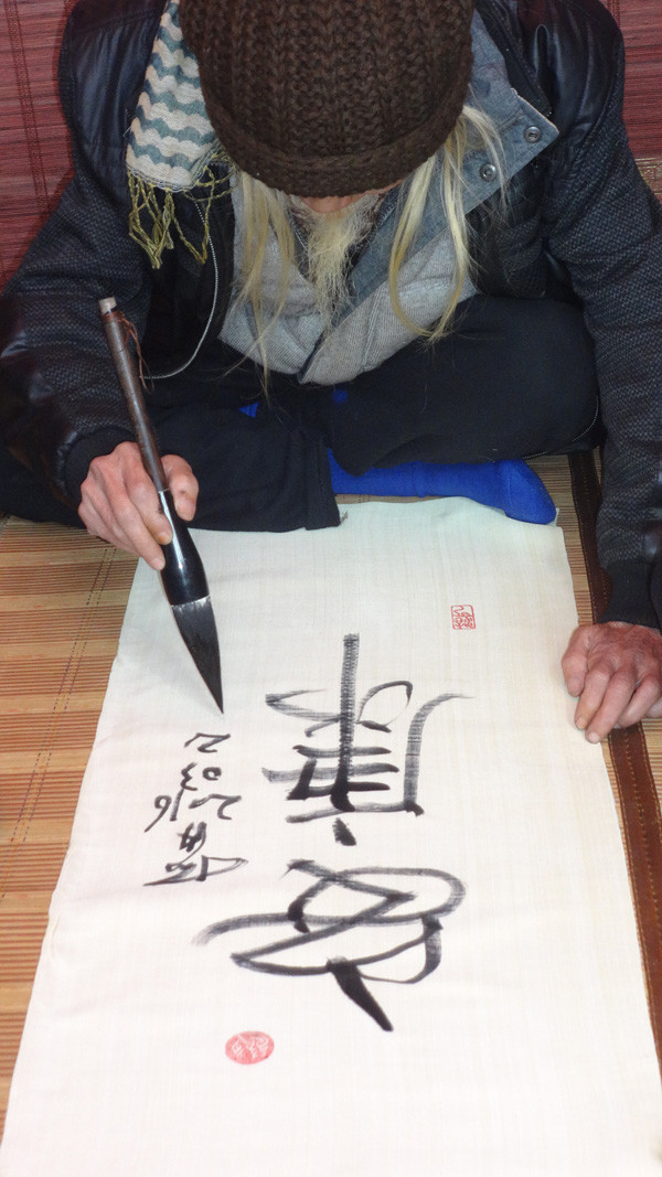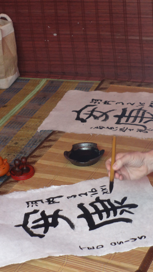 Hoàn thành buổi viết thư pháp, ông Osius cùng thầy Lược thực hiện các động tác thư giãn.