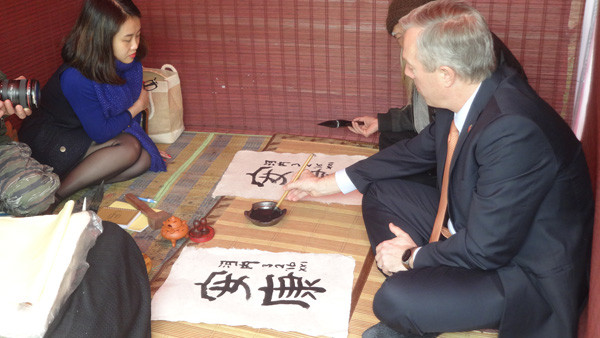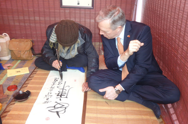 Ngài đại sứ chăm chú theo dõi thầy Lược "múa" bút, thỉnh thoảng lại thốt ra lời khen bằng tiếng Việt "siêu đẹp".