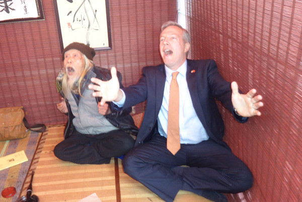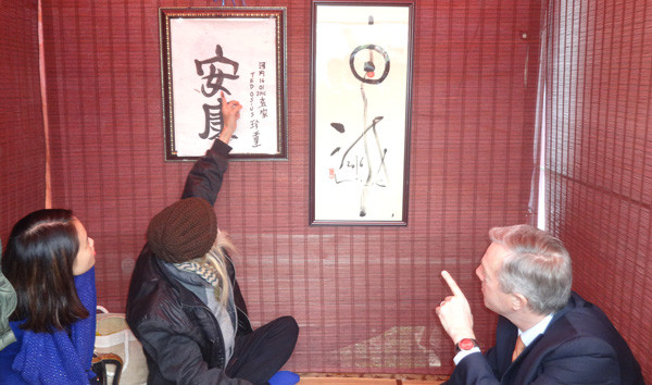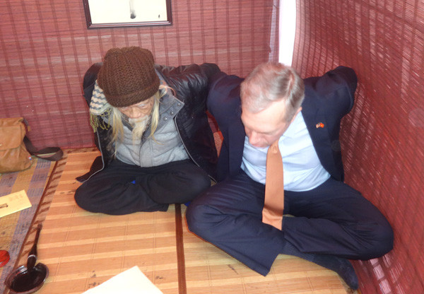 Trước khi bắt đầu viết thư pháp, thầy Lược hướng dẫn Đại sứ Hoa Kỳ các bước thư giãn cơ thể đầu tiên để có thể ngồi viết thoải mái nhất.