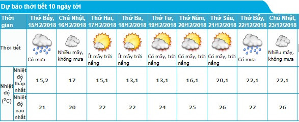 Sang đến Chủ nhật (16/12), Hà Nội không mưa, nhiều mây, trời âm u. Nhiệt độ trong ngày tăng hơn so với hai ngày trước đó, vào khoảng 17-20 độ C. 5 ngày tiếp theo, thời tiết chuyển biến theo hướng tích cực hơn, trời ít mây, có nắng, nhiệt độ cao nhất lên đến 25-26 độ C.