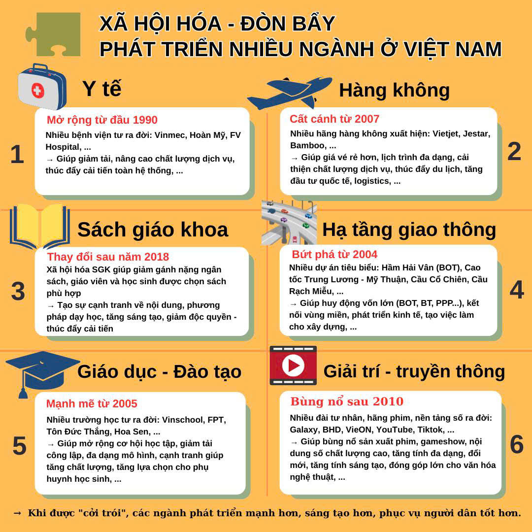 Dưới đây là một số ngành nghề đã chuyển mình rõ nét nhờ xã hội hoá, với các mốc thời gian quan trọng: