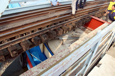Lúc này, nước đang lớn theo triều cường đầu tháng 12. Ý thức được vấn đề, các thủy thủ cùng các đơn vị hỗ trợ đã cùng nhau bơm nước vào khoang trống để hạ thấp xà lan. Mui trước của sà lan đã qua được nhưng bất ngờ, phần mui sau lại dính chặt vào thân cầu.