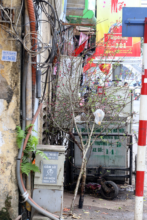 Trên nhiều ngõ phố nhỏ, hay trước cửa nhiều nhà, những cành đào cũng bị bỏ chỏng chơ, chờ công nhân vệ sinh đến thu gom.