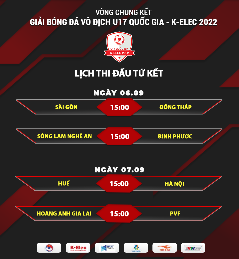 Sau vòng bảng, giải U17 Quốc gia K-Elec 2022 tạm nghỉ và sẽ trở lại với vòng tứ kết vào ngày 6/9 với 2 cặp đấu: U17 Sài Gòn gặp U17 Đồng Tháp và U17 Sông Lam Nghệ An gặp U17 Bình Phước. Cả 2 trận đấu cùng diễn ra lúc 15h.