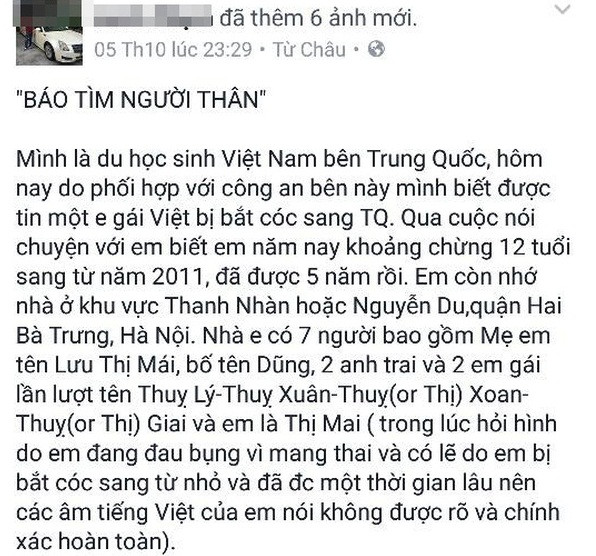 Trước đó 6 ngày, một du học sinh người Việt Nam tại Trung Quốc chia sẻ trên trang facebook cá nhân với dòng trạng thái: “Hôm nay do phối hợp với công an bên này mình biết được tin một em gái Việt bị bắt cóc sang Trung Quốc. Qua cuộc nói chuyện biết em năm nay khoảng 12 tuổi, sang đây từ năm 2011. Em còn nhớ nhà ở khu vực Thanh Nhàn hoặc Nguyễn Du, quận Hai Bà Trưng, Hà Nội. Nhà em có 7 người bao gồm mẹ em tên Lưu Thị Mái, 2 anh trai và 2 em gái. Trong lúc hỏi do em đau bụng vì mang thai và có lẽ do em bị bắt cóc sang từ nhỏ nên các âm tiếng Việt của em nói không được rõ và chính xác hoàn toàn".