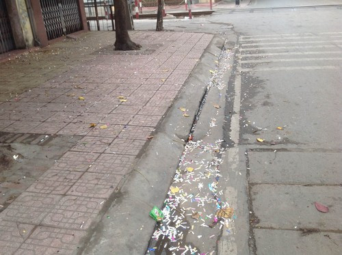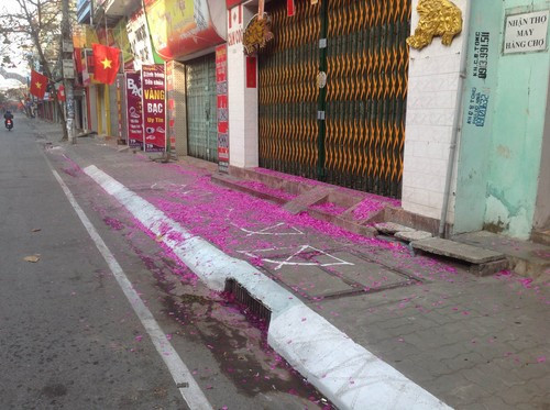 Đến sáng mùng 1 tết, dấu vết đốt pháo tại Nam Định vẫn còn nguyên với những con phố đỏ xác pháo.