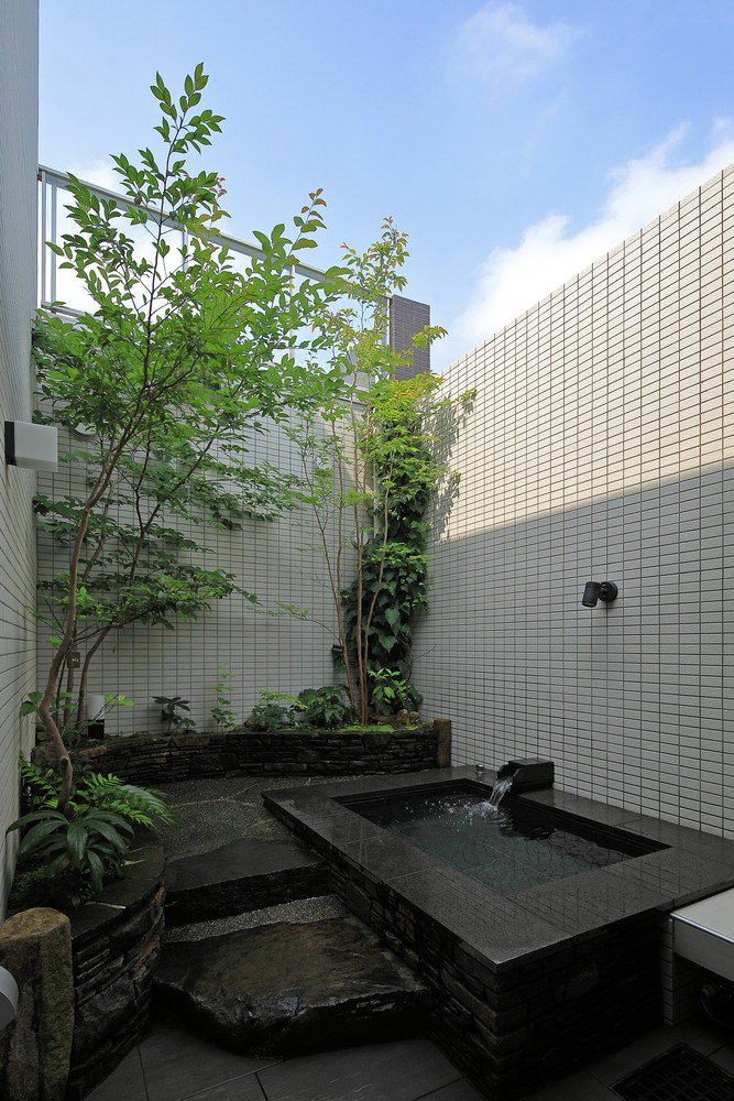 | Khu vườn chính, nằm ở phía Nam của phòng khách, giống như một bụi cây, trong khi sân phụ nằm giữa phòng khách và phòng ngủ. Sân thứ ba chính là bể tắm lộ thiên. Mỗi sân trong đều có sự khác biệt trong thiết kế và có vai trò riêng của mình. |