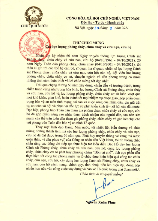 "Nhân dịp kỷ niệm 60 năm Ngày truyền thống lực lượng Cảnh sát Phòng cháy, chữa cháy và cứu nạn, cứu hộ (04/10/1961 - 04/10/2021), 20 năm Ngày toàn dân phòng cháy, chữa cháy (04/10/2001 - 04/10/2021), tôi thân ái gửi tới các thế hệ cán bộ, sĩ quan, hạ sĩ quan, chiến sĩ lực lượng Cảnh sát Phòng cháy, chữa cháy và cứu nạn, cứu hộ; cán bộ, đội viên lực lượng phòng cháy, chữa cháy cơ sở, chuyên ngành và dân phòng trong cả nước những tình cảm thân thiết và lời chúc mừng tốt đẹp nhất.