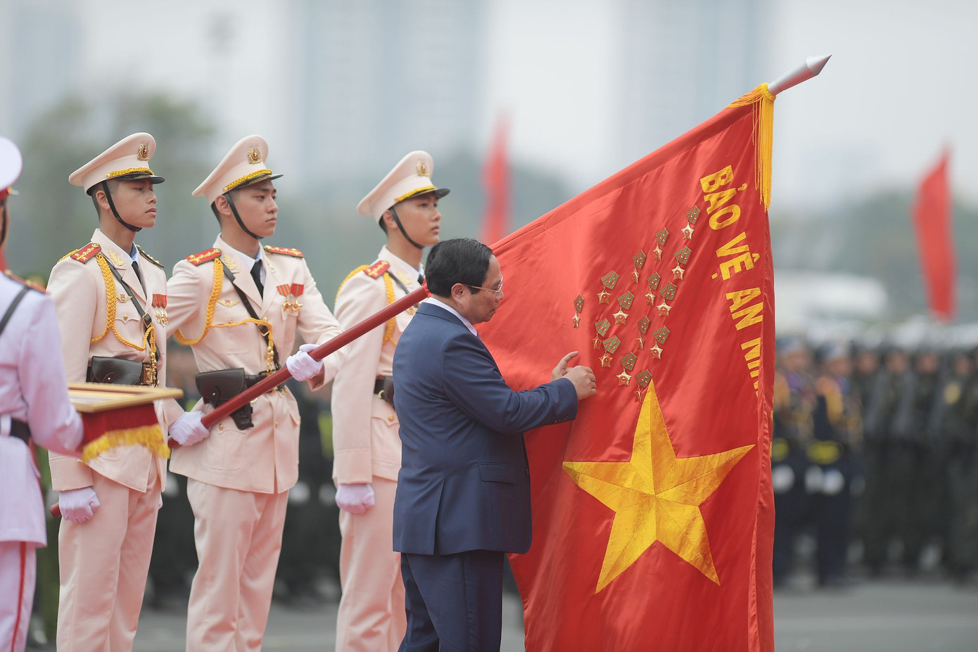 | Thủ tướng Phạm Minh Chính đã thay mặt lãnh đạo Đảng, Nhà nước trao tặng danh hiệu Anh hùng Lực lượng vũ trang nhân dân cho lực lượng Cảnh sát cơ động. Ảnh: Dương Triều. |