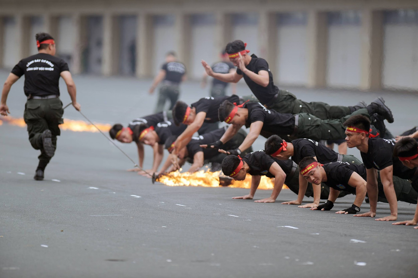 Trong không khí trang trọng của lễ kỷ niệm, hơn 5.000 cán bộ chiến sĩ của Bộ Tư lệnh Cảnh sát cơ động đã thể hiện sức mạnh của mình thông qua việc biểu diễn diễu binh trang nghiêm, với các động tác đều và mạnh mẽ.