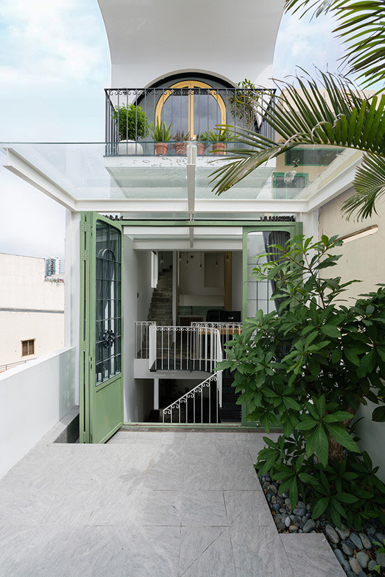 Sự lùi lại của 3 tầng nhà phía trên đã tạo ra một không gian làm sân vườn ở mái tầng 3.