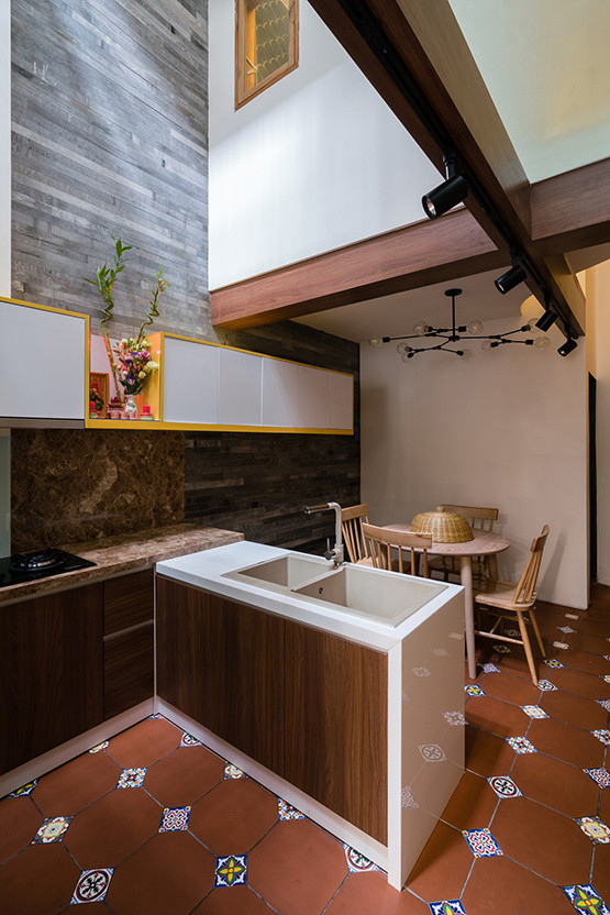 Khoảng thông tầng xiên giúp khu vực bếp và phòng ăn có thể nhận tối đa ánh nắng vào buổi sáng, thời gian gia đình có nhiều hoạt động nhất trong ngày ở đây.
