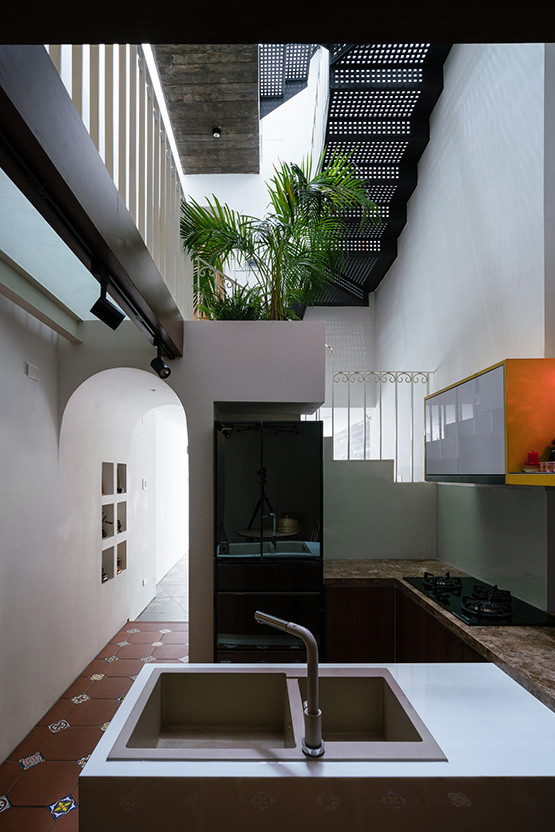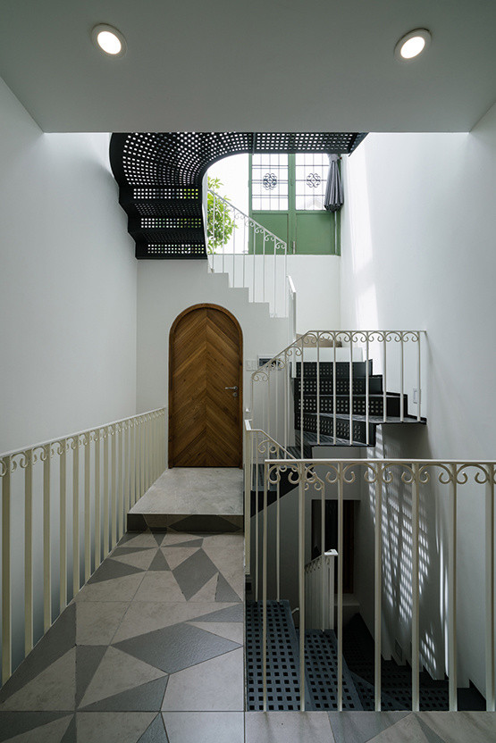 Ngoài khoảng thông tầng ở giữa nhà, cuối nhà còn một khoảng thông tầng khác giúp nắn lại thế đất góc cạnh. Thông tầng phía sau tiếp tục áp dụng phương pháp xiên, tăng hiệu quả thông gió, lấy sáng đồng thời thống nhất một tổng thể hình khối kiến trúc vươn về phía trước.