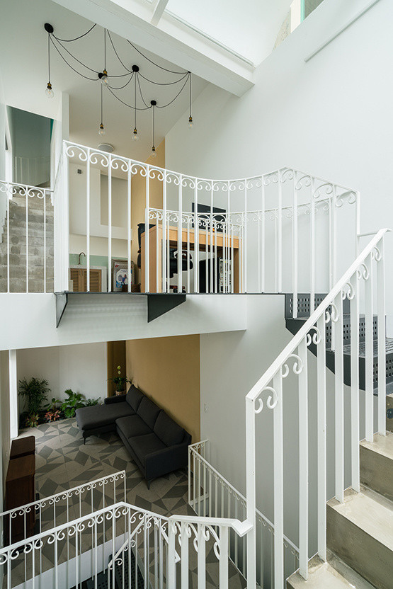 Do diện tích sàn mỗi tầng chỉ 36 m2 nên thông tầng chính ở giữa chỉ được phép chiếm một phần diện tích nhỏ, khoảng 9m2.
