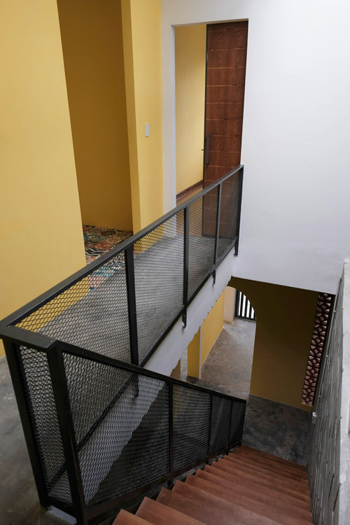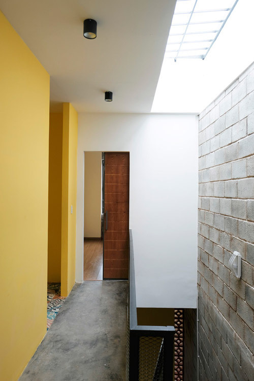 Ngôi nhà sử dụng gạch táp lô, sàn bê tông mài... với tông màu xám. Kiến trúc sư bổ sung thêm những mảng màu vàng đem lại sự sinh động.