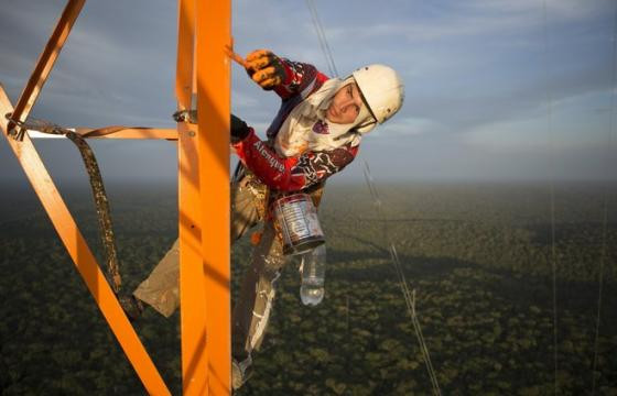 Một công nhân đang sơn màu da cam cho tháp. Dự kiến tháp đi vào hoạt động vào tháng 7 tới.