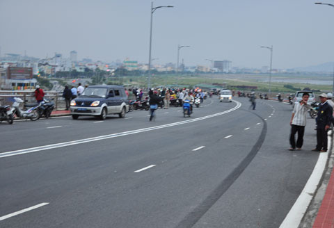 Trước khi tông đứt lan can cầu Thuận Phước, chiếc xe để lại vệt ma sát