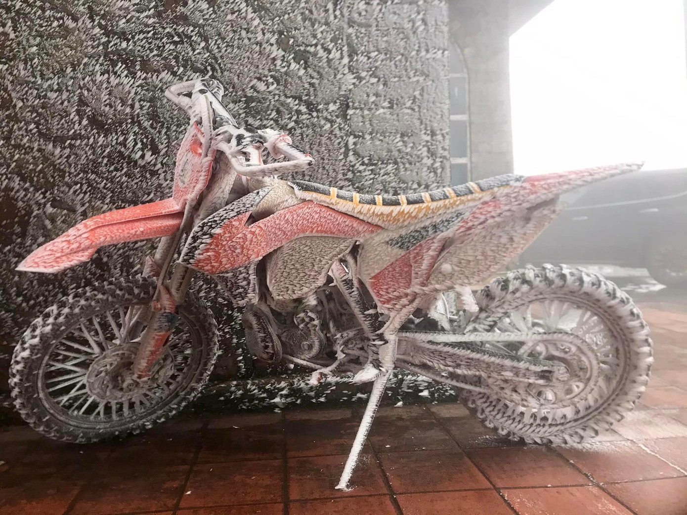 Điển hình, một chiếc mô tô địa hình bị bao phủ bởi lớp băng tuyết dày khoảng 3 cm, bám lên từng chi tiết. Điều này cho thấy chiếc xe được để ngoài trời và đã bắt đầu đóng băng từ đêm 22/1 đến rạng sáng nay, ở nhiệt độ dưới 0 độ C.