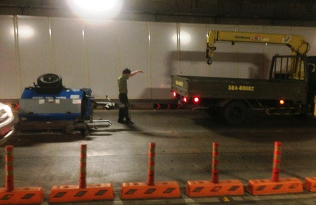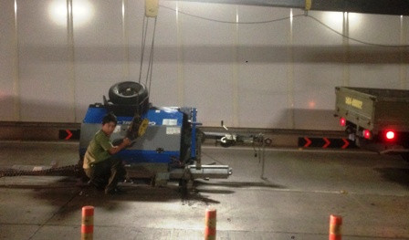Khi chạy đến giữa hầm, bất ngờ móc khóa giữa thiết bị với xe bị bung ra, thiết bị máy rớt xuống nằm chắn ngang giữa đường. Rất may một số ô tô đang chạy phía sau đã kịp né tránh nên không xảy ra tai nạn liên hoàn trong hầm.