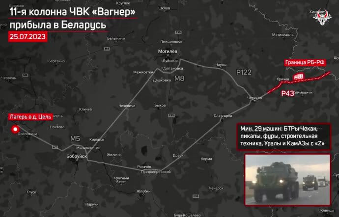 Theo báo cáo của Belaruski Hajun, từ ngày 11-18/7, ít nhất 5 đoàn xe của binh lính Wagner đã đến Belarus. Trong đó có khoảng 400 phương tiện, và 2.500 lính đánh thuê.