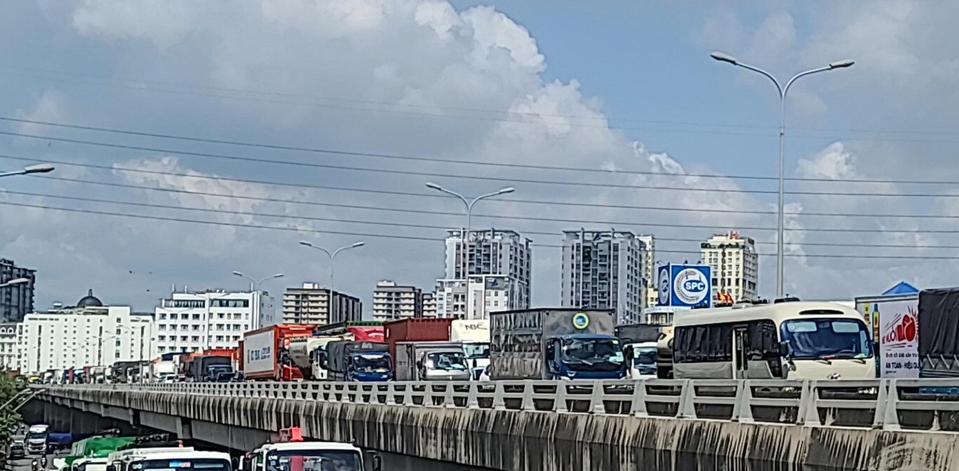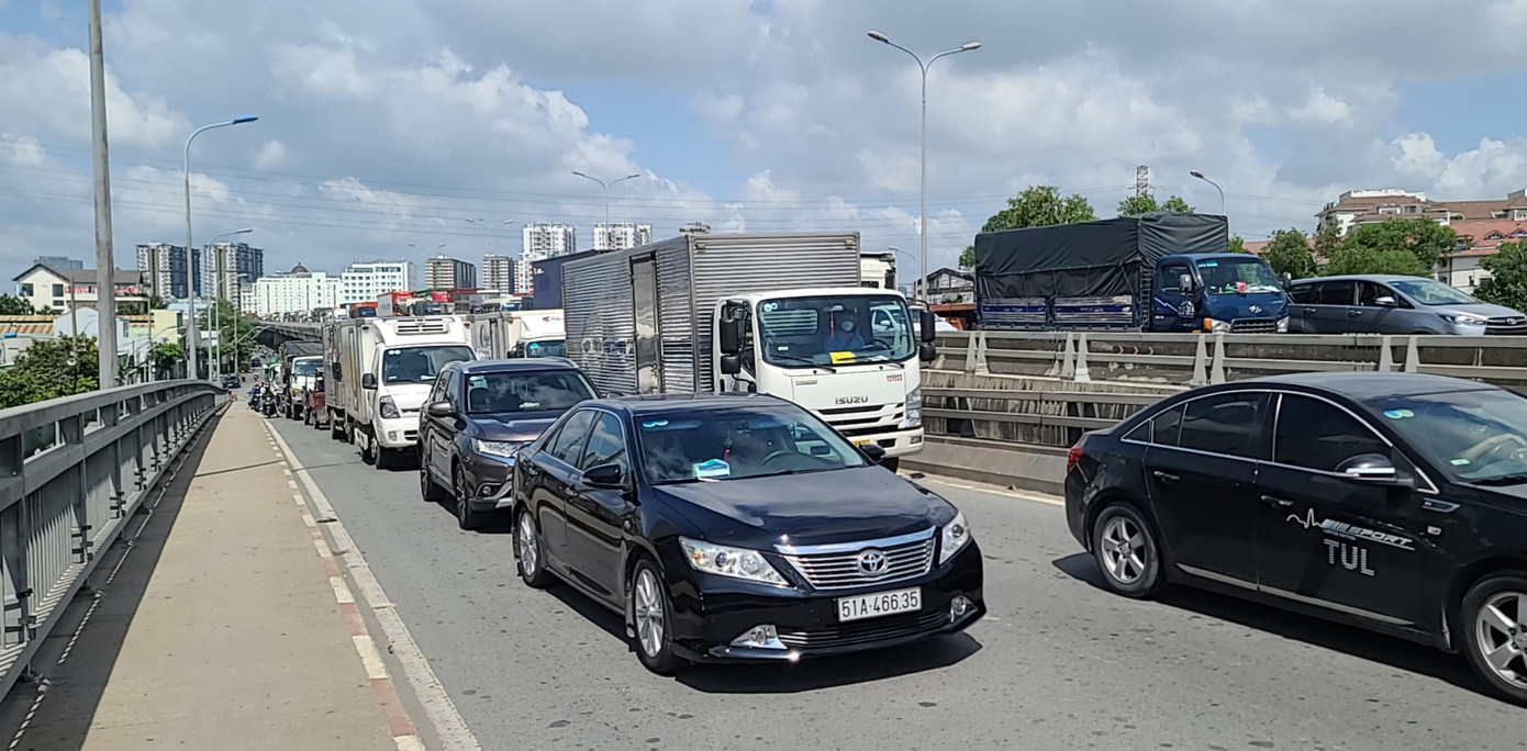 Vụ cháy khiến các phương tiện qua khu vực phải di chuyển chậm, giao thông ùn ứ kéo dài hơn 1km từ vị trí xảy ra sự cố đến đường trên cao phía bờ quận 7.