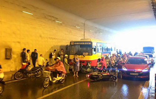 Hơn 14h chiều 31/10, dòng xe đang dừng đỗ mặc áo mưa dưới hầm Kim Liên theo chiều về Xã Đàn (Đống Đa, Hà Nội) thì bất ngờ xe buýt số 35 chạy tuyến Trần Khánh Dư - Mê Linh lao vào. Nhiều người hoảng loạn tháo chạy.