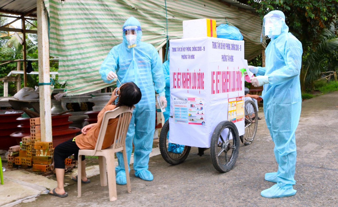 Ghi nhận của phóng viên tại phường Tân Hưng, quận Thốt Nốt, TP Cần Thơ vào sáng ngày 12/9. Những chiếc xe cá viên được “hô biến” thành xe lấy mẫu xét nghiệm COVID-19 lưu động di chuyển trên đường quê khiến nhiều người thích thú.
