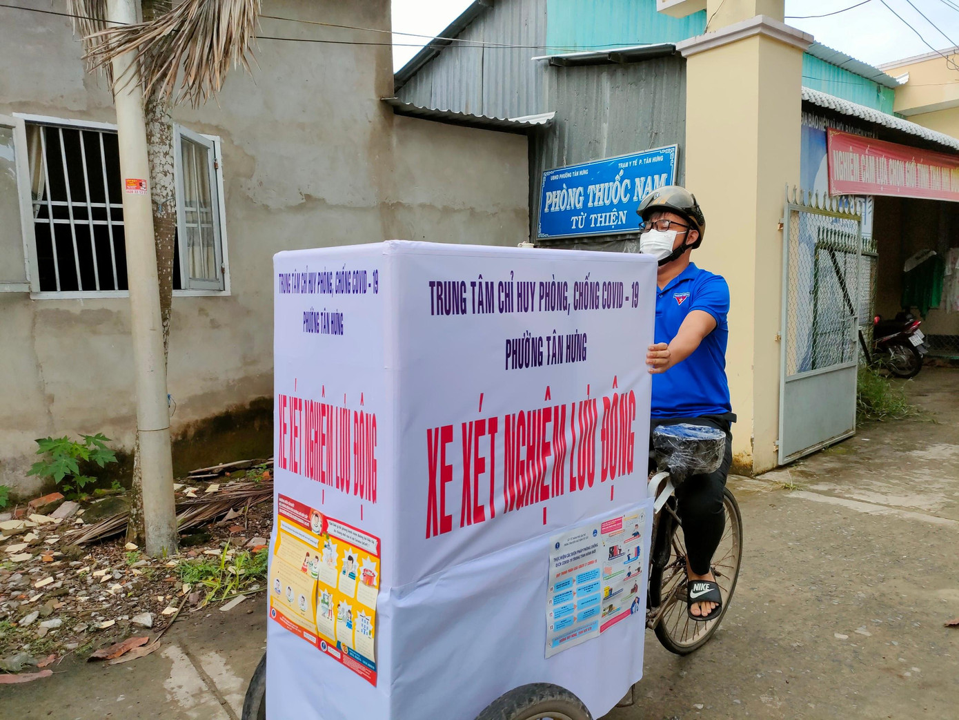 | Lực lượng Đoàn viên thanh niên phường Tân Hưng hỗ trợ đưa các "xe cá viên chiên" đến các khu vực lấy mẫu. |