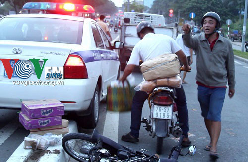 Người dân chứng kiến cho biết, khoảng 17h ngày 7/10, xe ô tô đặc chủng của Đội Cảnh sát giao thông An Lạc (Công an Tp.HCM) đang tuần tra trên đại lộ Võ Văn Kiệt thì phát hiện một nam thanh niên điều khiển xe máy chở hàng cồng kềnh lưu thông vào làn xe ô tô.