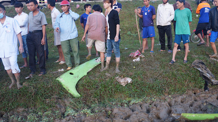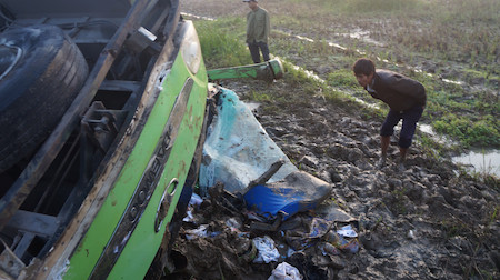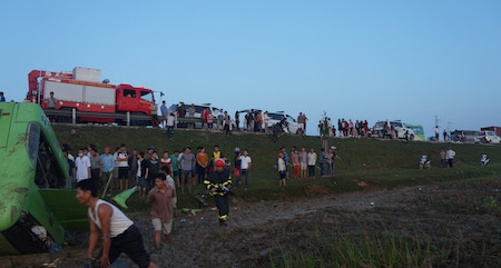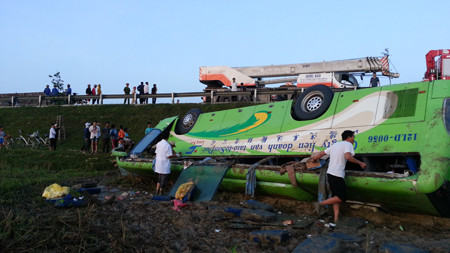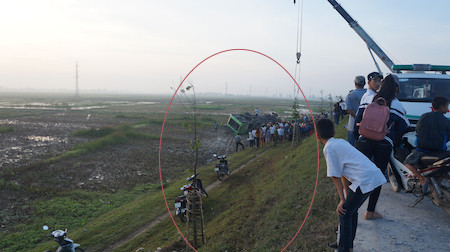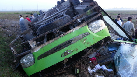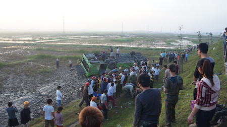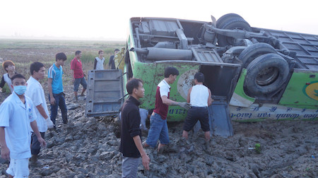 Một số hình ảnh chiếc xe khách chở công nhân lao xuống ruộng làm ít nhất 10 người bị thương.