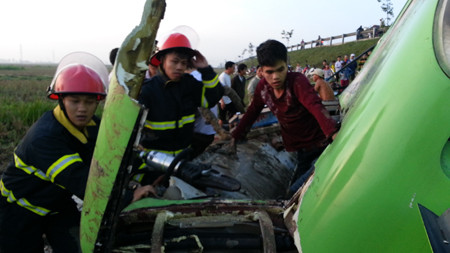 Theo ghi nhận của PV, tại hiện trường chiếc xe khách lật ngửa gần như bẹp dúm, nhiều người còn mắc kẹt trong xe, kính xe vỡ nát, nhiều bộ phận của xe như ghế, ắc quy xe cũng bay ra ruộng nằm ngổn ngang.