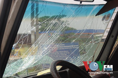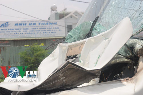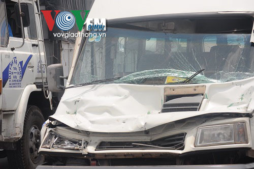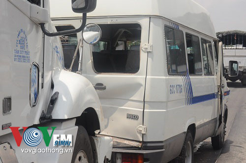 Tại hiện trường, chiếc xe 16 chỗ bị bẹp dúm phần đầu và đuôi xe, kính chắn gió phía trước bị bể, nhiều bộ phận của xe bị hư hỏng nặng. Chiếc xe đầu kéo bị hư hỏng phần đầu, dầu nhớt chảy khắp đường.